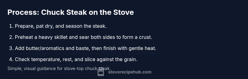 Chuck steak, cut from the shoulder, is known for its deep beefy flavor and forgiving texture when cooked with care. On the stove, it rewards a patient approach: a fast, high-heat sear to develop a rich crust, followed by a longer, controlled finish that helps break down connective tissue without turning the meat dry. According to Stove Recipe Hub, chuck steak shines when you use a heavy pan, keep the surface dry, and manage heat so the crust forms without scorching the fat. This combination of Maillard-driven crust and careful interior cooking is what makes a weeknight chuck steak feel special. You’ll learn how to trim, season, heat the pan, and time the finish so every slice remains juicy and flavorful even if you’re cooking for a small family or a busy kitchen.