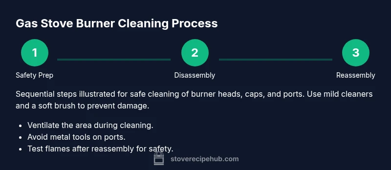 You will learn to clean gas stove burners safely using common household items and a few specialty tools. Gather nitrile gloves, a soft brush, mild degreaser, baking soda, vinegar, dish soap, a spray bottle, and a plastic toothpick for ports. Follow a 8-step process from safety prep to final flame test—then maintain with regular cleanings. According to Stove Recipe Hub, consistent care improves performance and safety.