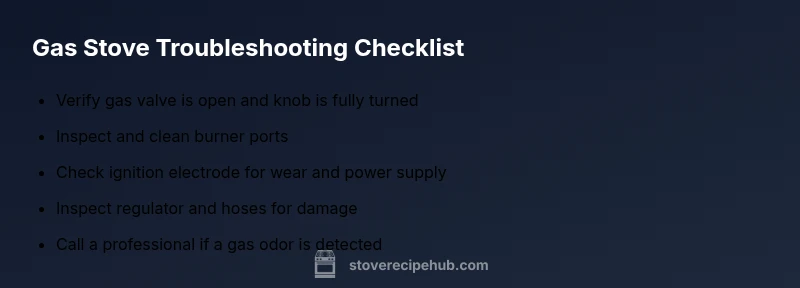 A non-working gas stove isn't just a cookware nuisance; it can signal safety hazards in your kitchen. According to Stove Recipe Hub, most problems begin with something simple you can verify quickly—a gas supply valve, a clogged burner, or a misfiring ignition. In this guide we expand on how these issues arise and how to assess them safely. You’ll learn to differentiate between routine maintenance tasks and situations that require professional help. The goal is calm diagnosis, safe action, and restoring reliable performance as soon as possible. This article emphasizes safety-first instincts and clear, practical steps you can follow in real kitchens.