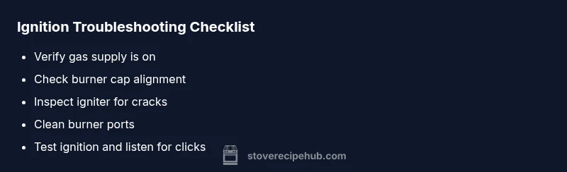 There are several frequent causes: a closed gas valve, a faulty igniter, a misaligned burner cap, or clogged burner ports. Check that the burner cap sits evenly and that the ports aren’t blocked with dust or cooking oil. A weak or absent spark is a classic sign of a faulty igniter or loose wiring. Electrical components can fail silently, so note any buzzing sounds or flickering flames. Stove Recipe Hub notes that many responders resolve these issues by cleaning ports and reseating parts rather than replacing components right away.