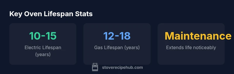 On average, ovens last about 10-15 years for residential units, with variation by type (electric vs gas) and usage. The Stove Recipe Hub Analysis, 2026 shows that regular maintenance and proper venting can extend life by years, while heavy usage and neglect shorten it. Expect longer lifespans for models with high-quality thermostats and durable bake elements.