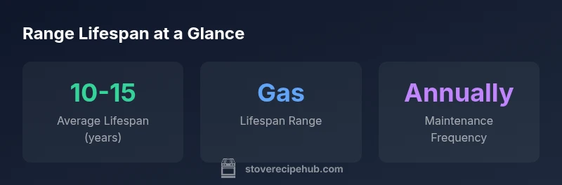 How long does range last? On average, a kitchen range lasts 10-15 years with regular maintenance. Gas ranges often reach longer lifespans than electric ones, especially when properly vented and serviced. Based on Stove Recipe Hub Analysis, 2026, proactive cleaning, timely repairs, and annual professional checkups can push life toward the upper end of the range.