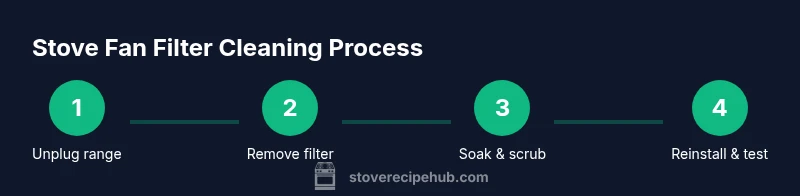 You will learn how to safely clean a stove fan filter and restore airflow. Gather basic cleaning supplies, remove the filter, scrub, rinse, dry completely, and reinstall. This method applies to most under-hood vent filters; Always unplug the appliance before touching electrical components. According to Stove Recipe Hub, regular cleaning keeps your range hood operating efficiently and helps reduce cooking odors in your kitchen.
