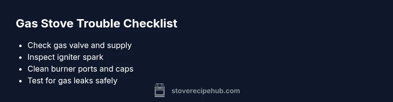 This section outlines a practical flow: (1) confirm gas supply is open; (2) test ignition and spark; (3) clean and realign burner components; (4) check for leaks with a soap solution; (5) test flame quality after each step. If at any point you detect a leak, smell gas, or cannot locate a fault safely, stop and contact a licensed professional. Stove Recipe Hub emphasizes safety-first troubleshooting to prevent accidents in the kitchen.