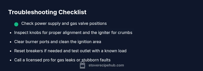 Begin with the simplest checks: confirm the stove is plugged in, the outlet has power, and the gas valve is open (for gas stoves). If you find a tripped breaker or blown fuse, reset/replace it and try again. This step eliminates half the common issues without tools.