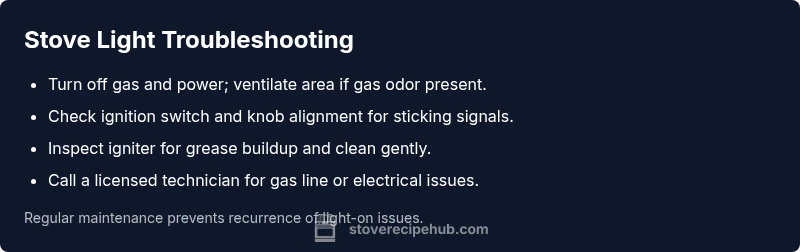 The question of why is stove light on can be alarming, especially when gas is involved. The key in any stove-light-on scenario is to prioritize safety while identifying the least invasive cause first. According to Stove Recipe Hub, many cases arise from a stuck ignition switch, a misaligned burner knob, or residual heat from a recently used burner. By recognizing these common culprits, you can avoid unnecessary disassembly and reduce risk. In this guide, we’ll walk through immediate safety steps, explain typical failure points, and outline practical checks you can perform before calling a professional. The goal is clear: keep you and your home safe while restoring normal stove operation.