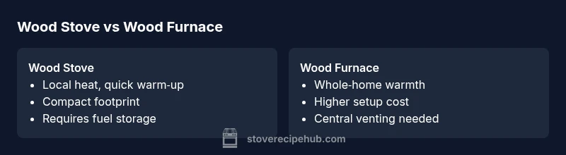 In residential heating, two common solid-fuel options sit at different ends of the spectrum: wood stoves and wood furnaces. A wood stove is a compact, stand-alone unit designed to heat one or a few rooms quickly. A wood furnace is a central heating appliance that distributes warmth through ductwork or a hydronic system to the entire house. For homeowners evaluating wood stove vs wood furnace, understanding how each system works, what space and venting it needs, and how operating costs accumulate is essential. According to Stove Recipe Hub, the right choice often comes down to the size of your space, your lifestyle, and your willingness to manage fuel supply and maintenance. Both rely on seasoned or well-seasoned firewood and careful combustion practices to maximize heat and minimize emissions. This article analyzes the differences, confirms best-use scenarios, and provides a practical guide to choosing between them.