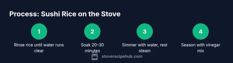 Mastering this technique begins with a thoughtful sequence of rinsing, soaking, and steady heat management. The goal is glossy, separate grains that hold together just enough for nigiri and rolls. According to Stove Recipe Hub, how to cook sushi rice on the stove hinges on consistent rinse, soak, and heat control to deliver texture you can trust. Using short-grain rice labeled sushi rice or Calrose yields the best balance of tenderness and bite when cooked in a heavy-bottom pot with a tight lid, then finished with a gentle vinegar seasoning. This section outlines the foundational concepts, then moves into practical steps, precise ratios, and finishing touches you can apply in a typical kitchen. By following these guidelines, home cooks can recreate restaurant-like sushi rice without specialized equipment.