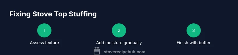 Dry, crumbly stuffing often lacks enough moisture or has started to dry out after standing. Soggy stuffing usually has too much liquid or has been left on heat too long, causing starch granules to swell excessively. Lumps come from starch that clumped together during mixing or reheating. Start by taking a small spoonful and noting texture: do you feel powdery, gummy, or cohesive? Smell tells you if butter or stock flavors are fading. The quickest fixes depend on the texture you describe. In practice, you’ll use a staged approach: treat dry batches with controlled moisture, gently evaporate excess liquid in soggy batches, and break up lumps with a fork or mash. This diagnostic step sets the stage for precise fixes rather than risky guesswork. In our guidance, the Stove Recipe Hub team emphasizes slow, incremental changes to preserve flavor and avoid overcorrecting.