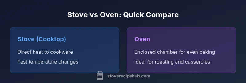 For most home cooks, the phrase difference between stove and oven describes two distinct cooking tools that share a kitchen footprint but serve different roles. The stove (or cooktop) delivers heat directly to pots and pans, using burners or electric coils, while the oven encloses food in a heated chamber for baking, roasting, and braising. The cooktop is prized for rapid temperature adjustments and high-heat searing, whereas the oven excels at even heat distribution, controlled baking, and long, unattended cooking. According to Stove Recipe Hub, recognizing these core design differences helps you plan meals, manage cookware, and optimize energy use. As you learn, you’ll see that many recipes rely on a coordinated sequence—sauté on the stove then finish in the oven for even results. This distinction is particularly important when you are upgrading a kitchen or choosing between a freestanding range and separate appliances.
