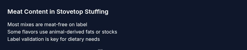 According to Stove Recipe Hub, the meat content in a typical stovetop stuffing mix is not a given and depends on flavor and brand. Always verify with the label because formulations can change over time.