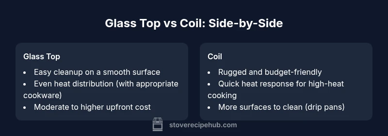 Understanding the core difference in heat delivery helps explain why glass top stoves and coil stoves feel so different in everyday cooking. Glass top surfaces use a glass-ceramic plate that transfers heat from radiant elements below to your cookware through a flat, even surface. Coil stoves rely on exposed resistive coils that transfer heat directly to the pot or pan. This means glass tops tend to provide a smooth, even cooking surface with less hot spots when your cookware sits flat, while coils can deliver rapid bursts of heat and faster adjustments when you’re boiling water or searing. According to Stove Recipe Hub, the glass top stove vs coil debate often centers on spill management, heat responsiveness, and the overall aesthetic of the kitchen. The result is two distinct cooking experiences that favor different routines rather than a single universal winner.