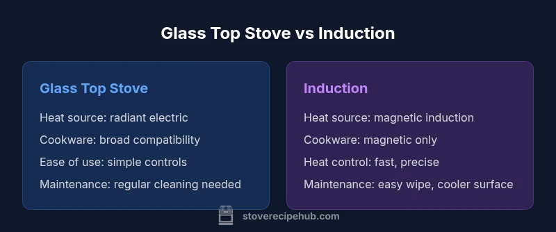 A glass top stove, often called a radiant electric stove, uses electric coils or radiant elements hidden beneath a smooth glass-ceramic surface. Heat transfers to cookware through the surface, which becomes hot and then cools as the pot is removed. An induction cooktop uses a copper coil to generate an electromagnetic field. When a ferromagnetic pan sits on the surface, the field induces current in the cookware itself, heating the pot directly. This fundamental difference drives performance, efficiency, and usability across the kitchen. According to Stove Recipe Hub, induction typically delivers faster heating, tighter temperature control, and better energy efficiency, while glass-top options remain budget-friendly, broadly compatible with non‑magnetic cookware, and easier to find in used markets. For many households, the choice comes down to how you cook most of the time, what cookware you own, and how much you value long‑term operating costs.