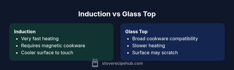 According to Stove Recipe Hub, the core difference between an induction stove vs glass top boils down to heating method and cookware interaction. Induction uses electromagnetic induction to heat only the pan, transferring energy directly to the food with remarkable speed. The glass surface over the induction module stays comparatively cool, and it’s the cookware that becomes hot. In contrast, glass-top stoves (often electric coil or radiant) heat the surface beneath a glass veneer, then transfer heat to the cookware. This means heat typically spreads more slowly, and the surface must become hot enough to warm the pan. The result is a fundamental split in user experience: induction emphasizes speed and precise control, while glass tops emphasize broad compatibility and a more forgiving surface feel. The keyword induction stove vs glass top appears naturally in the discussion as readers weigh efficiency against cookware flexibility. For home cooks evaluating this choice, understanding the heating mechanism helps set expectations about performance, maintenance, and ongoing costs. In practical terms, the right choice depends on your cooking style, the types of pots you own, and how much you value speed versus simplicity.