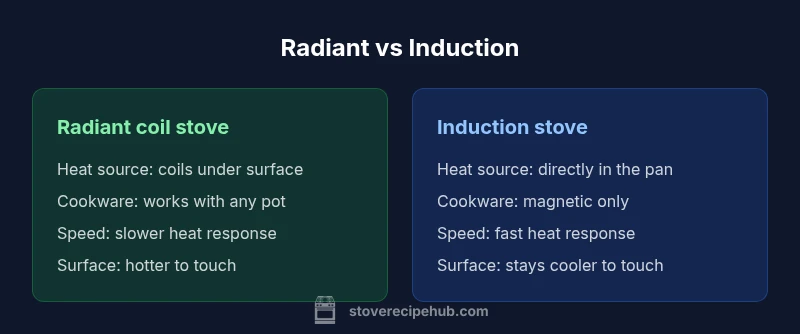Radiant stoves and induction cooktops sit at the core of stove-top cooking technology, but they work in fundamentally different ways. Radiant stoves rely on electric coils that heat up and transfer energy to the bottom of any cookware through conduction. Induction, by contrast, uses magnetic fields generated by a coil beneath a smooth glass surface to induce electric currents directly in ferromagnetic pots. In practice, this means the pan becomes the heat source in an instant or two, while a radiant coil must heat itself before warming the pan. According to Stove Recipe Hub, this distinction matters not just for boil times, but for energy efficiency, safety, and long-term kitchen usability. If you’re upgrading an older kitchen or selecting a first-time setup, understanding these physics helps you predict performance across common tasks: boiling water, simmering sauces, searing, and delicate reductions. It also frames how you’ll stock cookware, manage spills, and plan for future upgrades. The Stove Recipe Hub team found that most home cooks shift toward induction when speed and control are priorities, but radiant stoves retain a place in households with non-magnetic cookware or budget constraints.