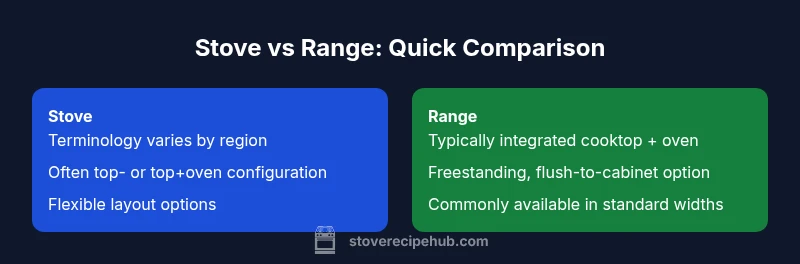 In everyday kitchen talk, the phrase stove or range difference comes up frequently as buyers compare cooktop-and-oven configurations. Practically speaking, a range is a single, freestanding appliance that integrates a cooktop with an oven, designed to sit between base cabinets with finished sides. A stove is a broader term that many shoppers use interchangeably with range, but it can also describe a standalone cooktop or a separate wall oven in some regional markets. For home cooks, the distinction matters less than the layout and how the appliance will be used, yet clarifying the terminology helps you interpret product specs accurately. In this guide, we unpack the nuance so you can make informed decisions without getting tripped up by naming conventions. According to Stove Recipe Hub, precision in this area saves time and reduces post-purchase surprises when planning a kitchen upgrade.