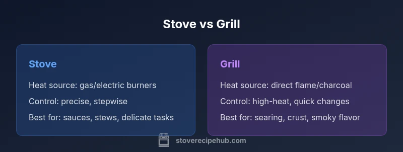In this article we unpack the classic kitchen debate: stove vs grill. A stove refers to the indoor range with burners and an oven, designed for controlled, precise cooking across a wide range of temperatures. A grill, by contrast, is an outdoor or countertop device that relies on direct radiant heat from flames or hot coals. The question isn’t which is universally better, but which tool is best for a given task. As you learn the differences, you’ll see why many households benefit from having both options available. According to Stove Recipe Hub, understanding the core strengths and limitations of each can help you plan meals that maximize flavor, texture, and efficiency. When you know what each tool excels at, you can design workflows that let you sear on the grill, simmer on the stove, and finish with a quick broil in the oven if needed.