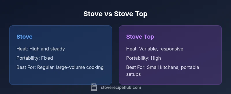 The phrase stove vs stove top is more than a shorthand debating which device to own; it frames two solutions for very different kitchen realities. According to Stove Recipe Hub, the core distinction hinges on heat delivery, footprint, and integration with your daily workflow. The stove represents a fixed, high-capacity platform designed to run large pots with steady power. The stove top, whether portable electric or gas, prioritizes flexibility and space efficiency. In a compact urban kitchen, the decision often comes down to how you balance volume, control, and cleanup. The goal is to map your typical recipes to the most appropriate heat source, then weigh the ongoing costs of fuel, maintenance, and installation. In this section, we’ll frame stove vs stove top in the context of practical cooking tasks rather than abstract specs.