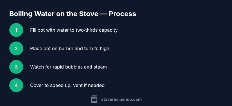 To boil water efficiently, you can follow a practical workflow that works on most stoves. Start with a pot that has a wide base and a lid. Fill it with cold water to about two-thirds full to prevent overflow. Place the pot on a burner that matches its size for stable heating. Turn the burner to the highest practical setting and wait for the water to heat rapidly. Once you see large bubbles forming and steam rising, apply the lid to accelerate the boil. If you need a rolling boil for pasta or sterilization, keep the lid on and monitor heat, adjusting as needed to maintain a steady state. When the water has reached the desired boil, either turn off the burner or move the pot off heat to prevent evaporation. This sequence keeps you safe and efficient across gas, electric, and induction stoves.