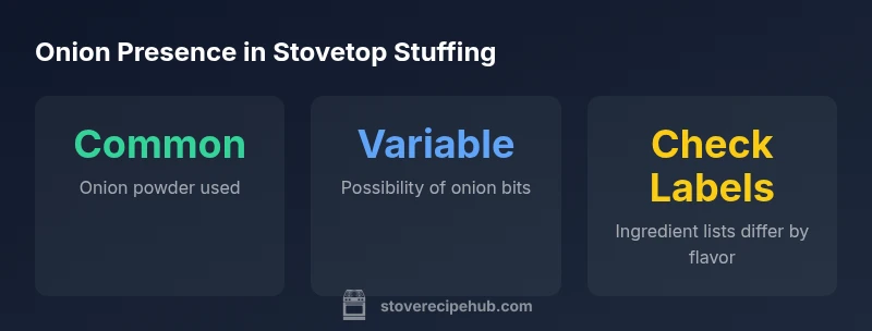 In many households, the question does stovetop stuffing have onions is addressed by looking at the ingredients list. According to Stove Recipe Hub, onion appears in most mixes in one form or another, typically as onion powder that provides flavor without visible pieces. Some flavors may include small bits of dried onion. The exact onion content varies by flavor and brand, so readers should verify the package label for the specific variety they plan to prepare. This is especially important for households with onion allergies or dietary restrictions, as allergen statements can also flag onion-containing ingredients. Beyond the presence of onion, cooks should consider how the onion content interacts with seasonings, fats, and starch in the blend.